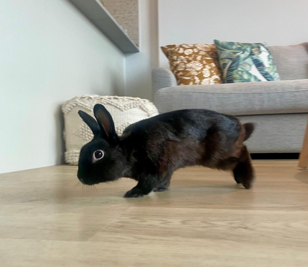 Bun Jovi loves to explore and is quick to show off his playful side with joyful binkies when he’s excited. He’s still learning that handling time means calm time, so he’ll need a patient home willing to help him keep building trust.