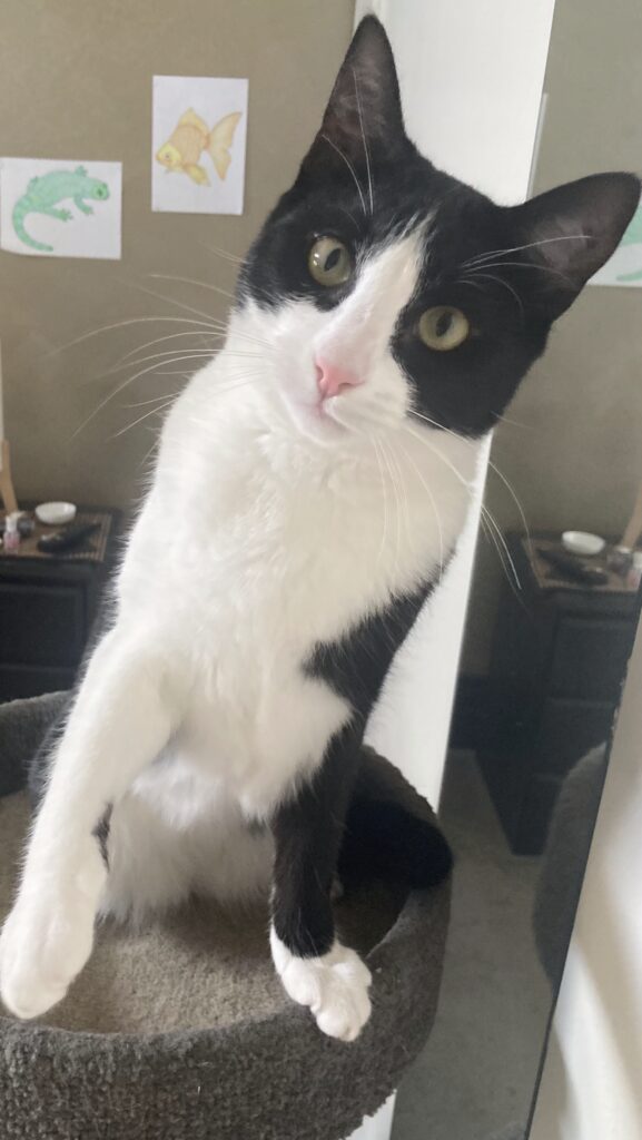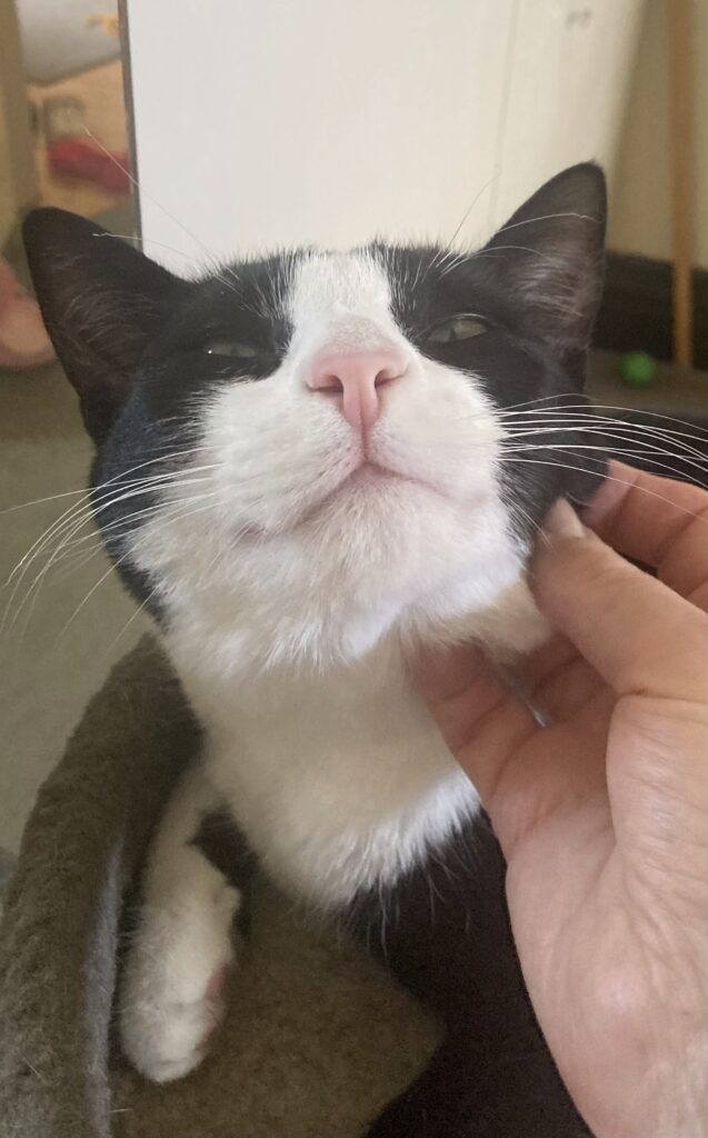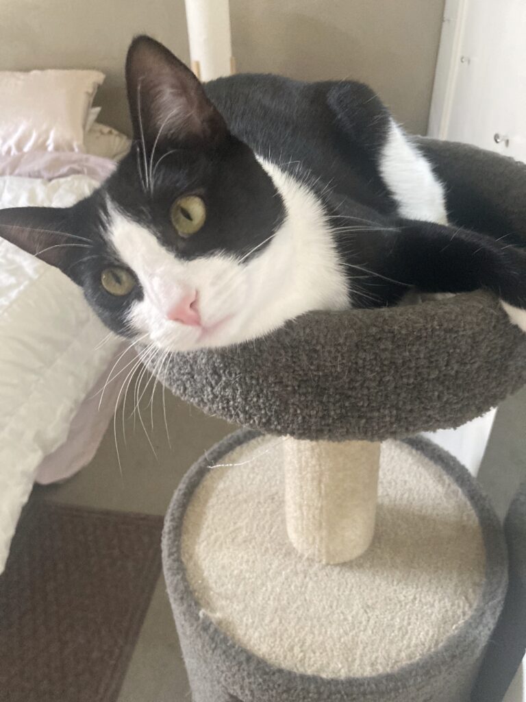 His favourite activity is to chase after a feather wand and dart after a lazer beam, and likes to spend his downtime sitting by the window bird-watching. He loves to curl up and sleep in the sunshine while his carer