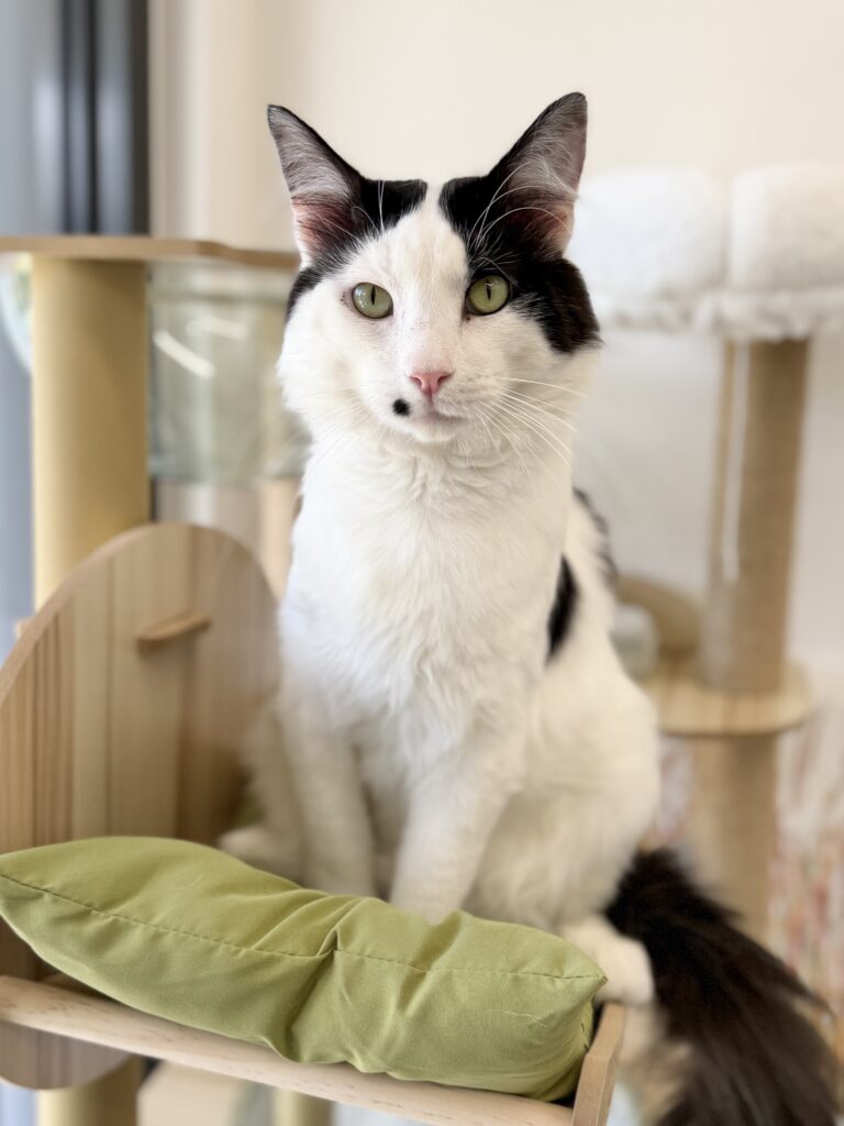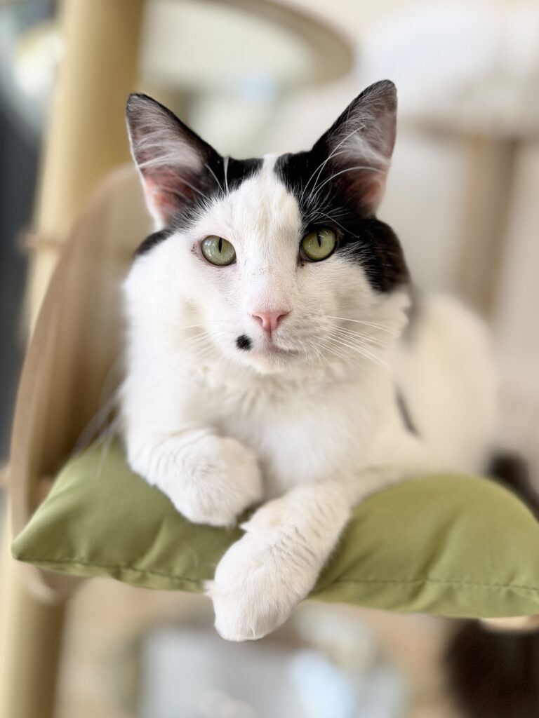 One thing you’ll learn quickly about Fev is his love of food! He knows exactly when mealtime is approaching and will happily announce it with the cutest little meows and chirps.