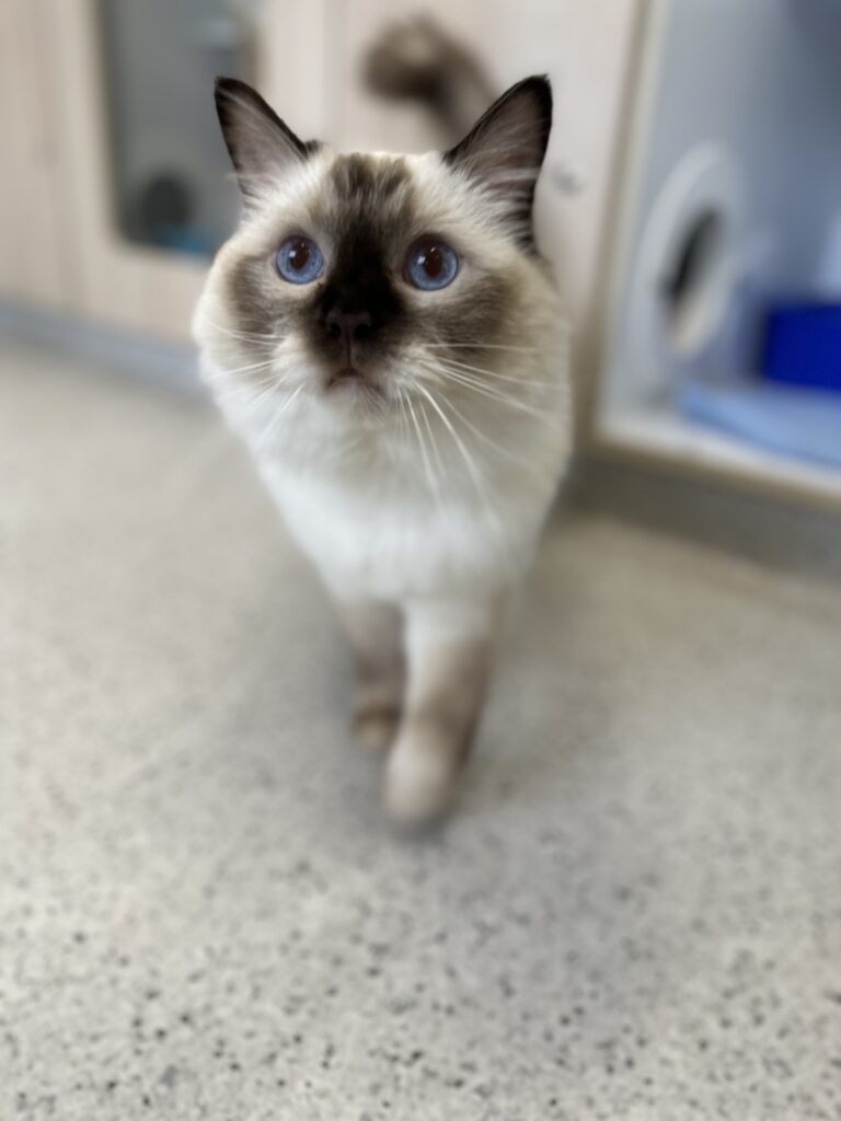 Martini is a stunning 6-year-old Ragdoll with a big personality to match his beautiful looks. True to the breed, this charming boy loves being around people and is always ready to greet visitors with curiosity and confidence. Martini is an outgoing, affectionate cat who enjoys attention, companionship, and being part of the action. Whether he’s following you around the house, chatting for pats, or settling in nearby for a nap, Martini is happiest when he’s spending time with his humans.
