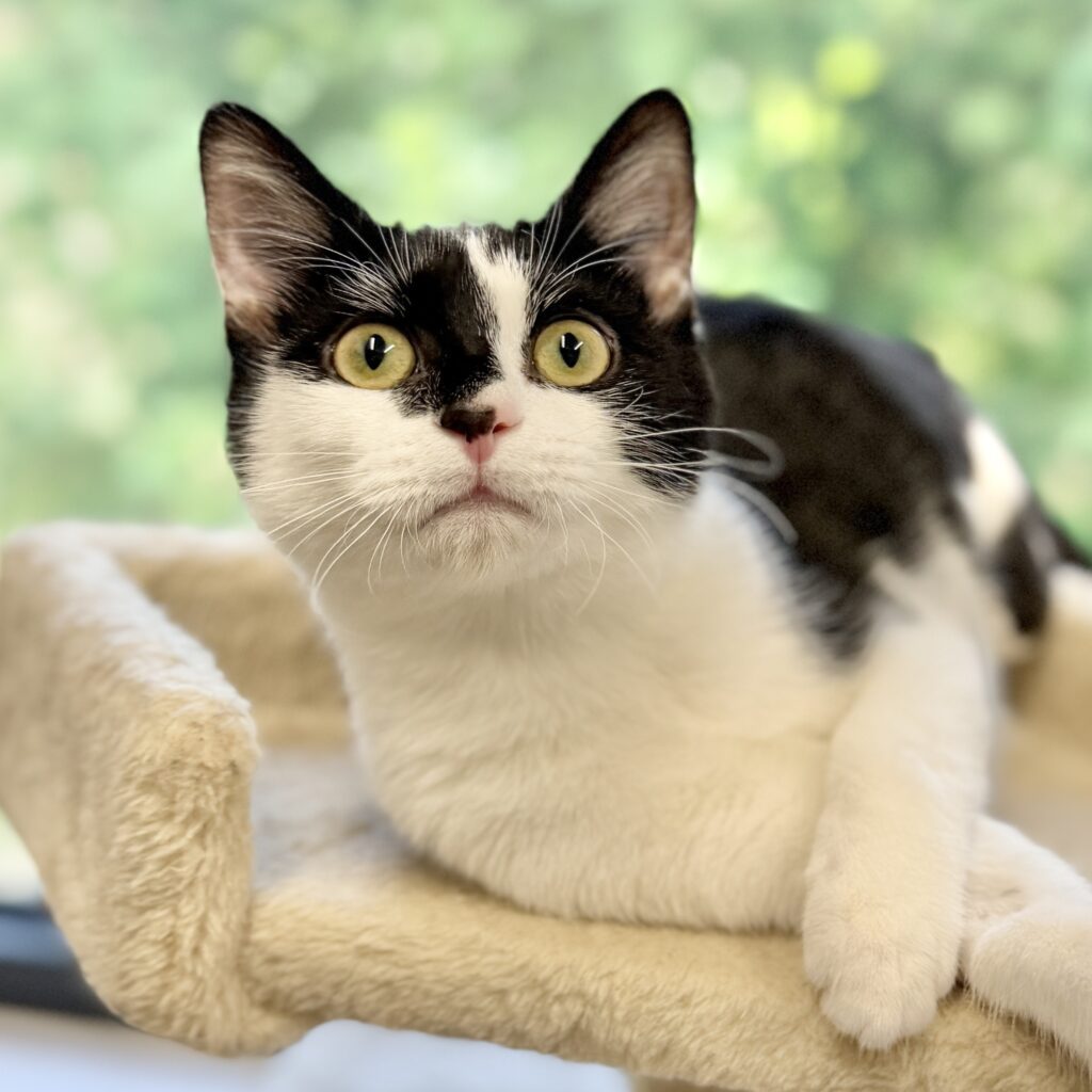 After she’s had her fill of playtime, her softer side shines. Once the toys are put away and the zoomies wind down, she happily transforms into a snuggly lap cat. She loves curling up close, soaking in affection, and rewarding her humans with loud, content purrs. A cozy blanket and a warm lap are among her favorite places to be.