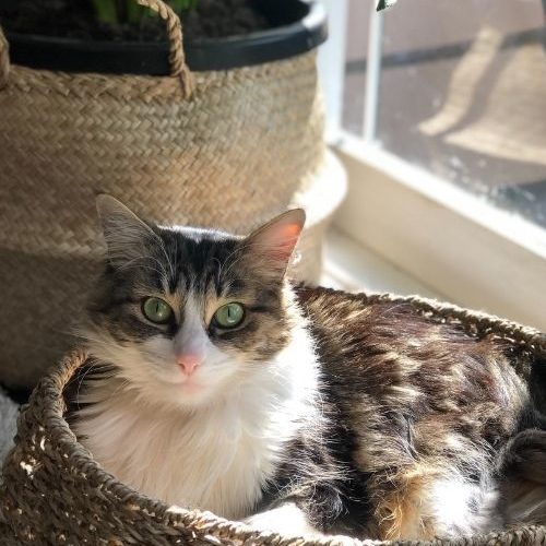 “She was a classic kitten and was into everything. She loved to sit on my son’s shoulder and still does! Trieste has always been a very affectionate cat, and wants to be with you all the time. If she isn’t sitting on my lap or draped over my shoulder, she is always nearby.”